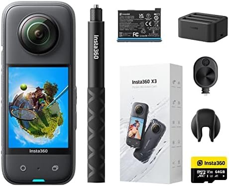 Includes 1x Insta360 X3, 1x 114cm Invisible Selfie Stick, 1x Bike Bundle, 1x 64GB microSD Card and 1x Lens Cap.
